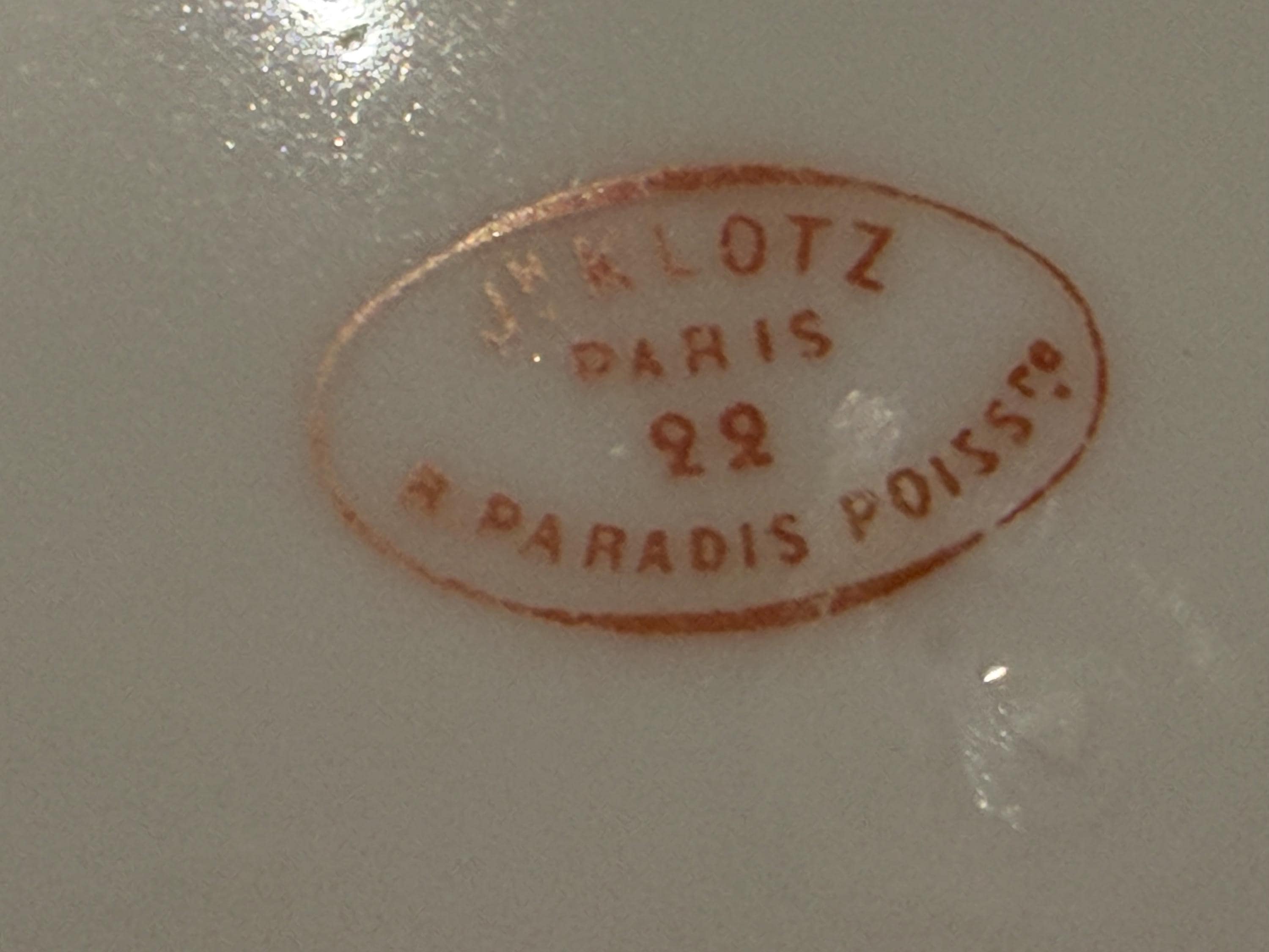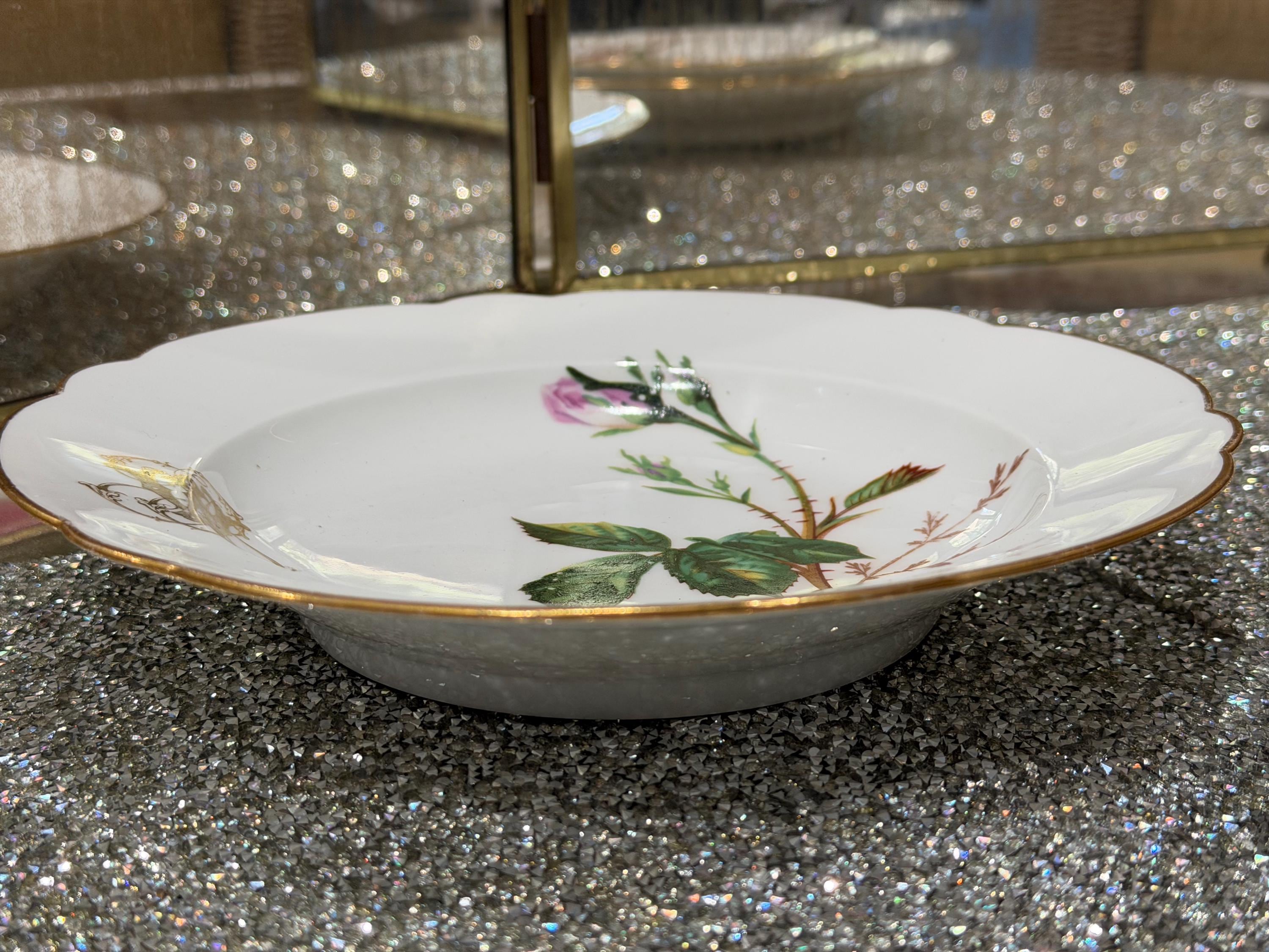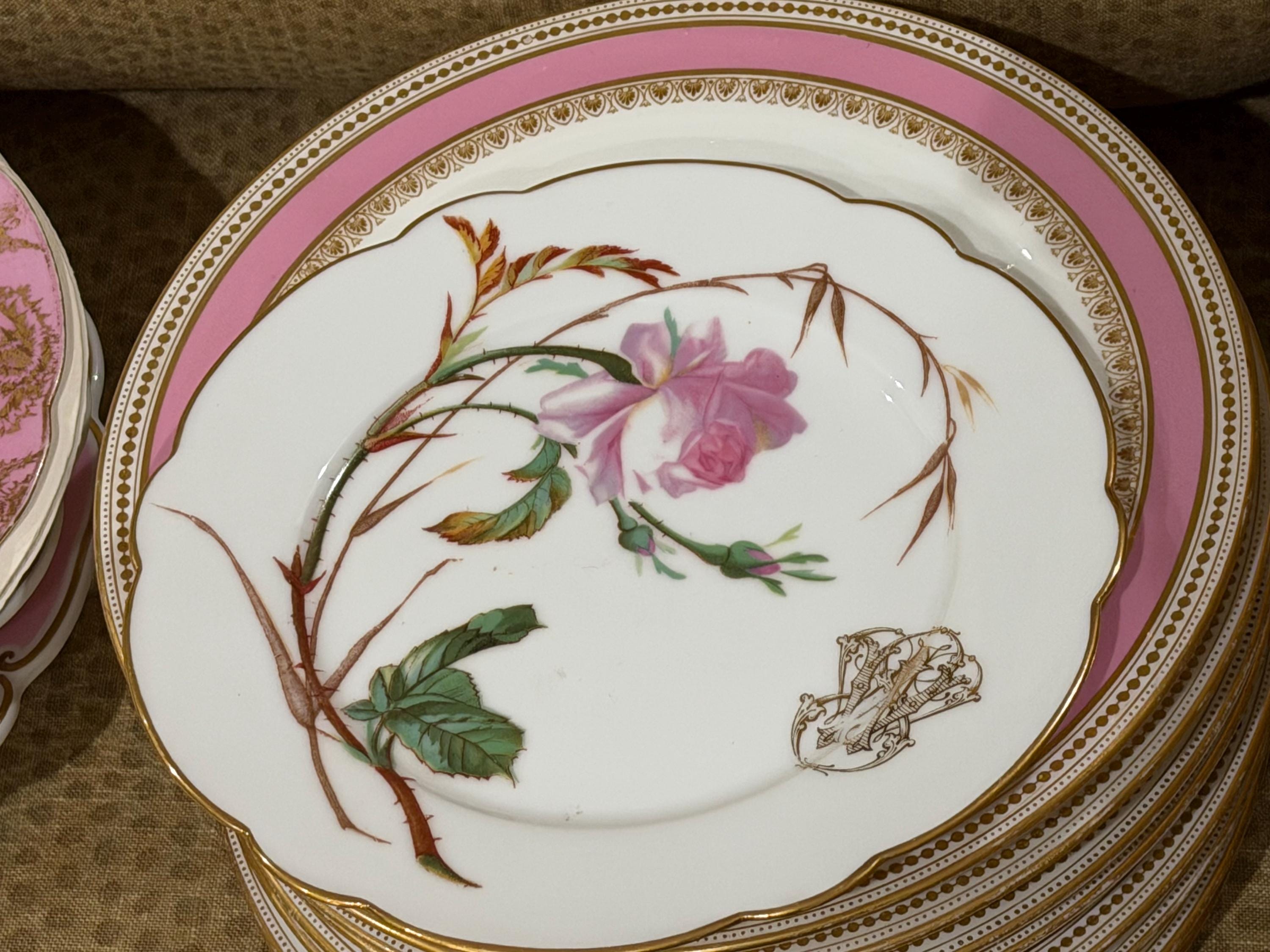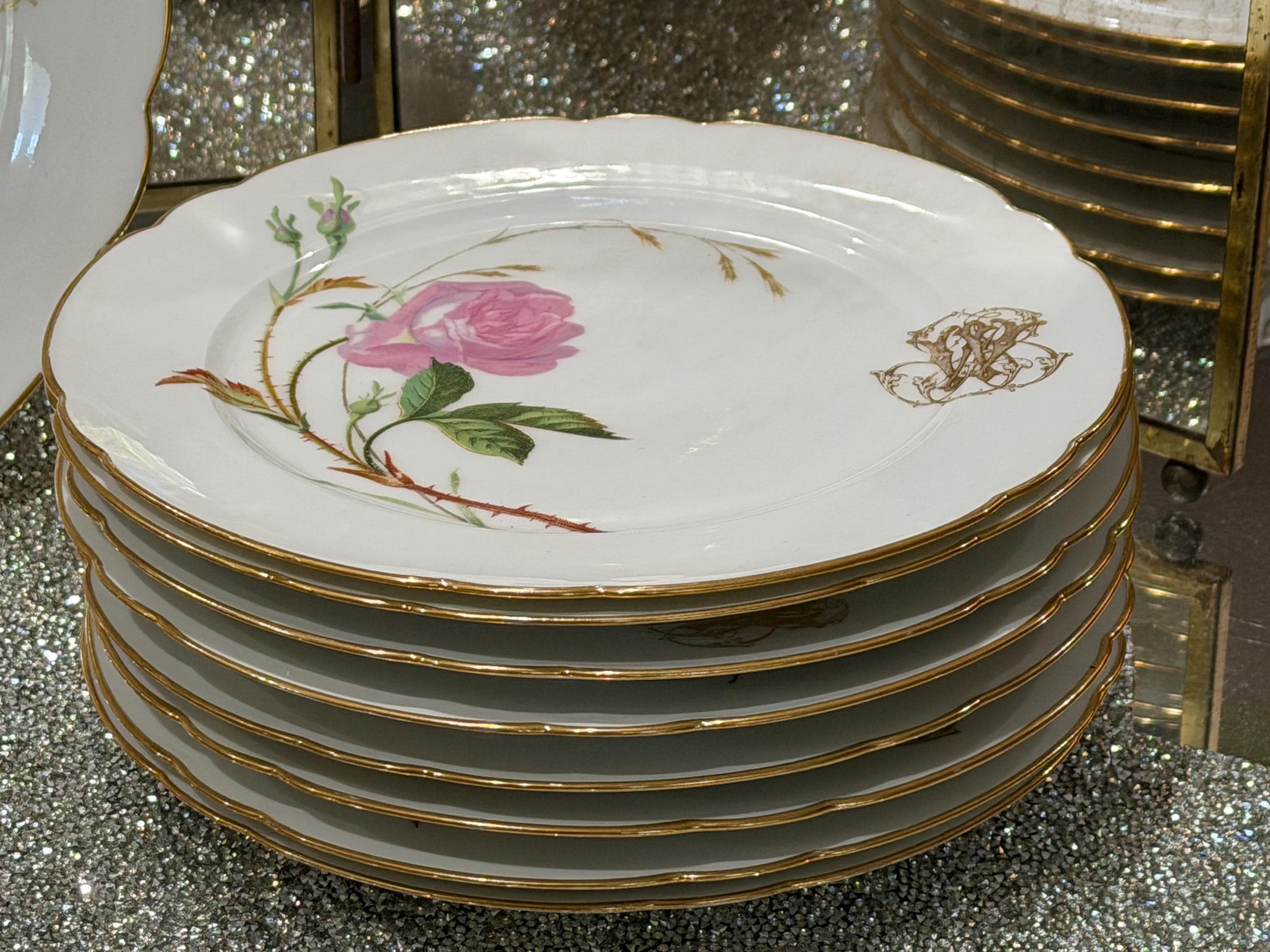 He had a famous boutique in Paris specializing in fine tableware. The porcelain pieces have been skillfully decorated with soft pink roses and an ornate monogram, characteristic of 19th-century taste for naturalism and botany.