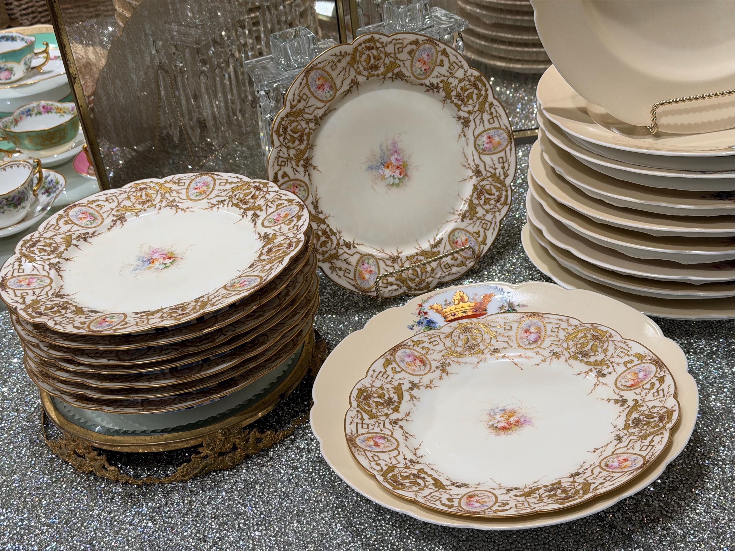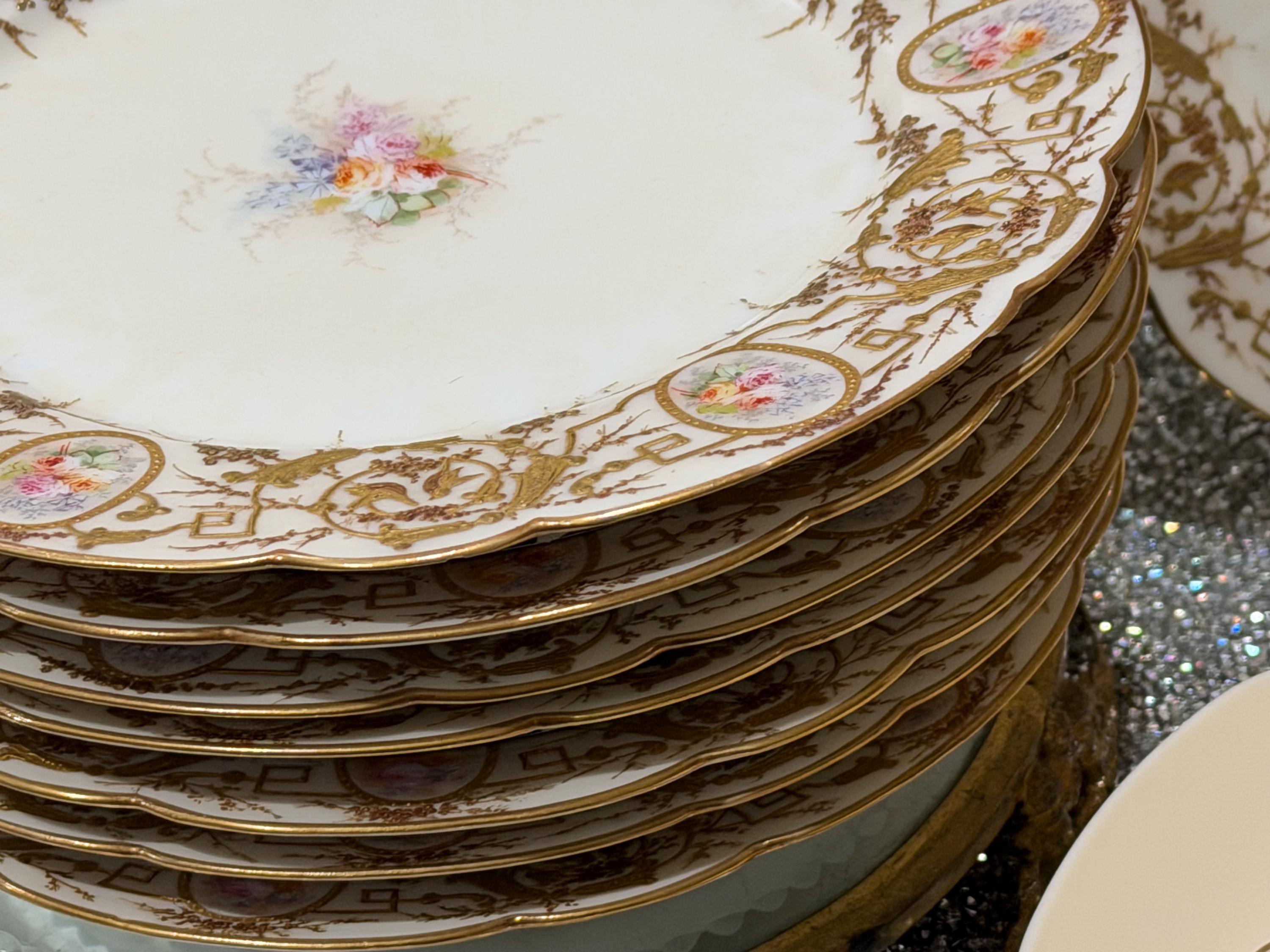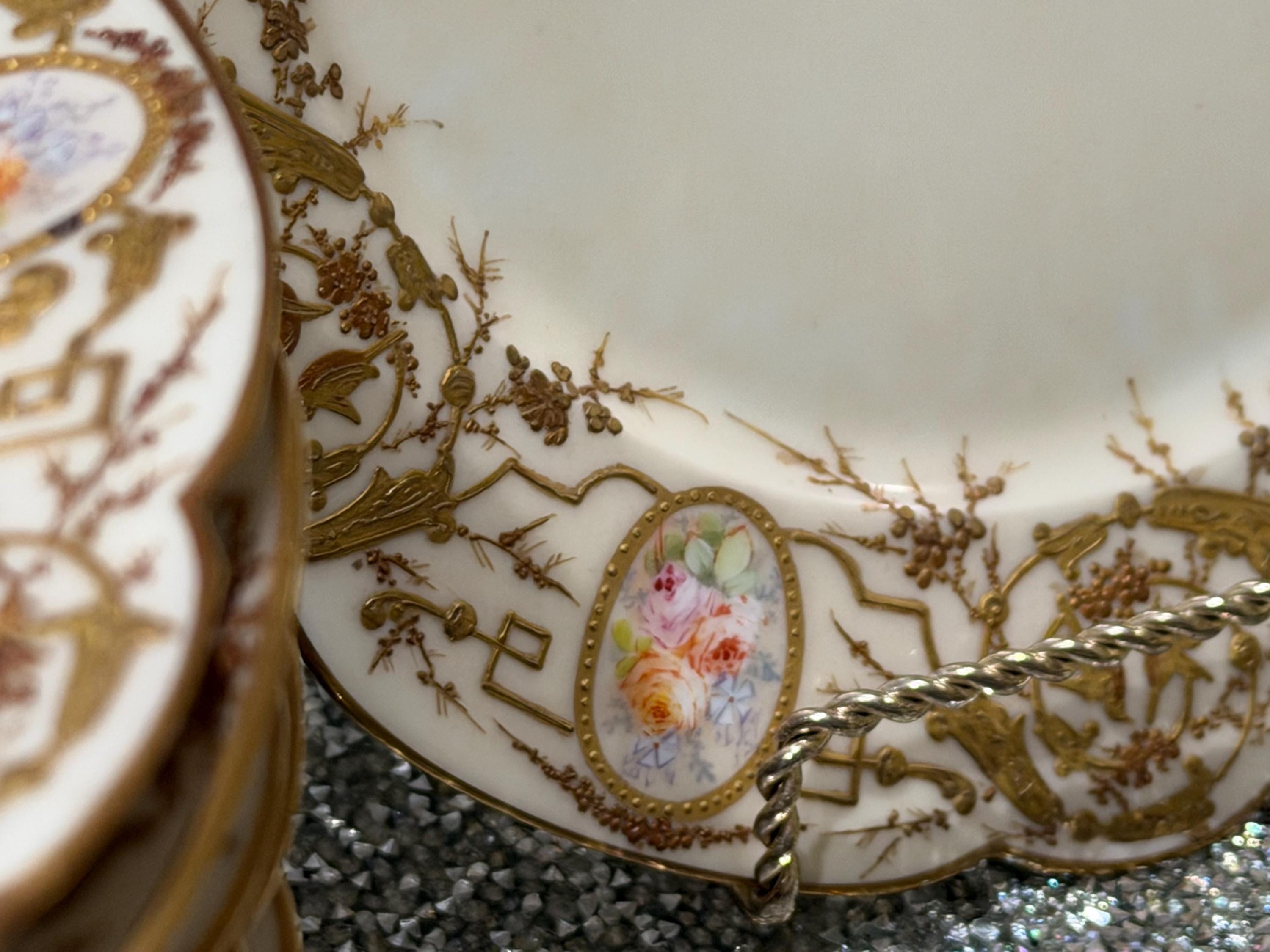 A 9-piece French Old Paris dessert set with an elaborate application of gilding, completely covering the border.