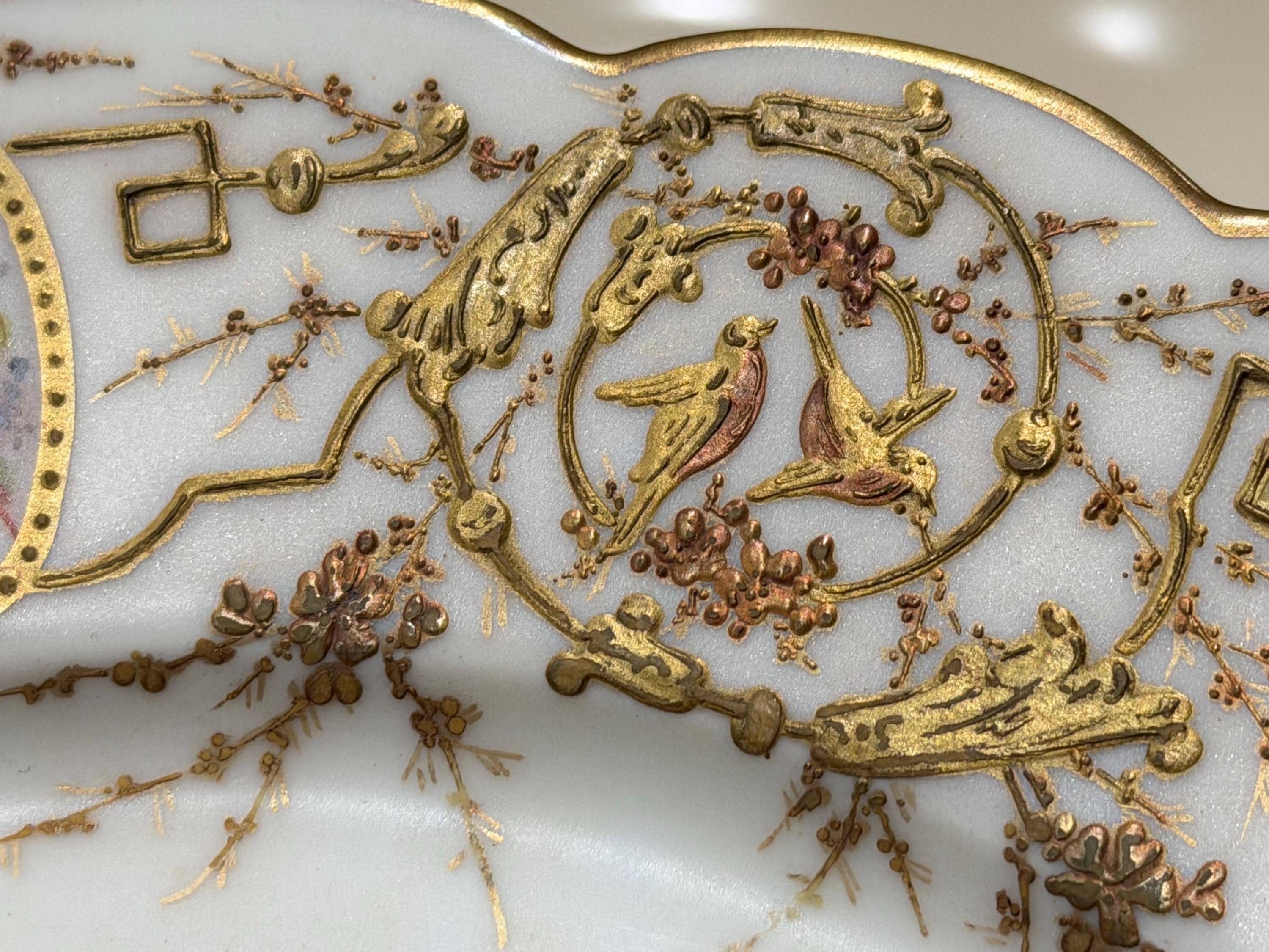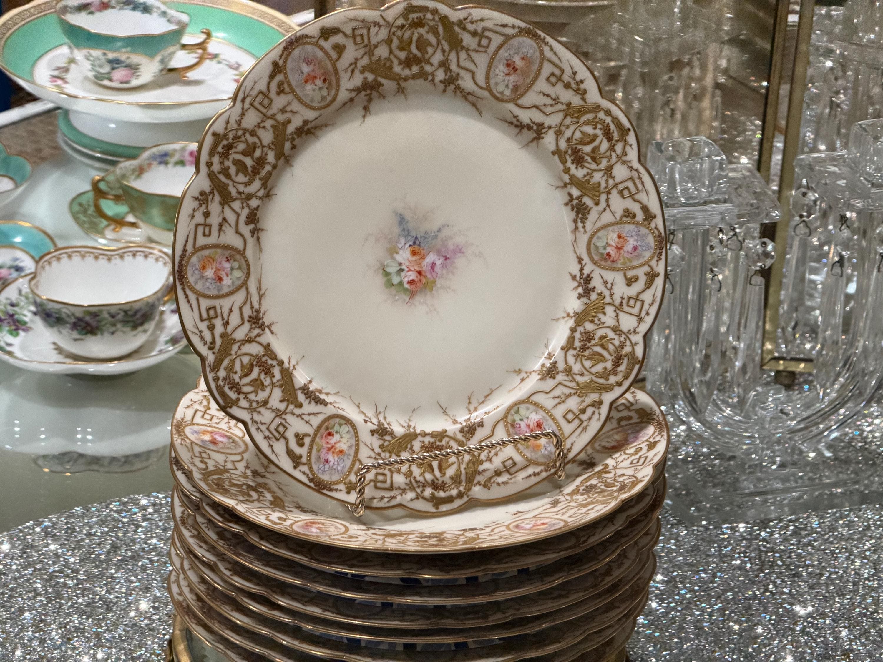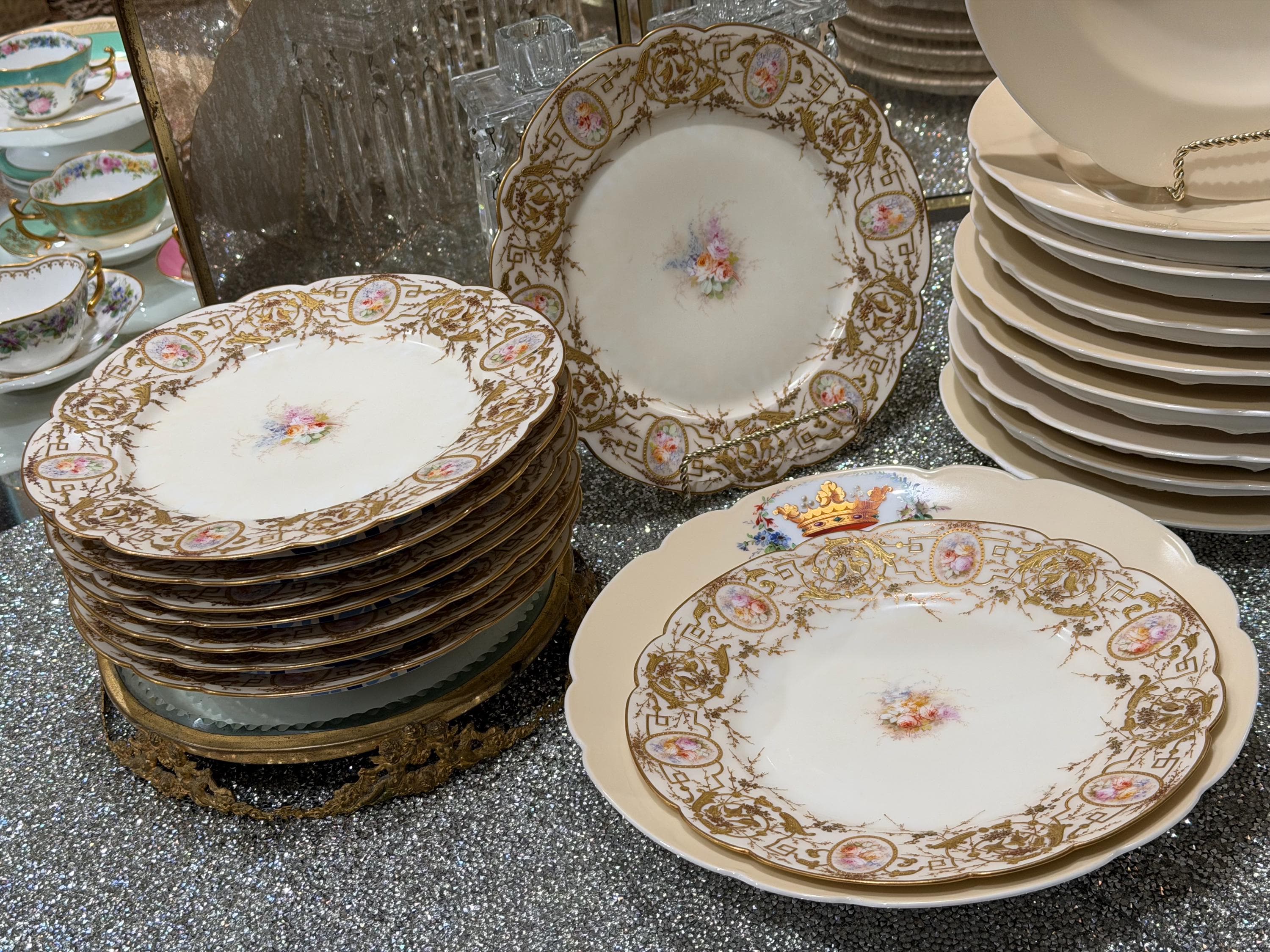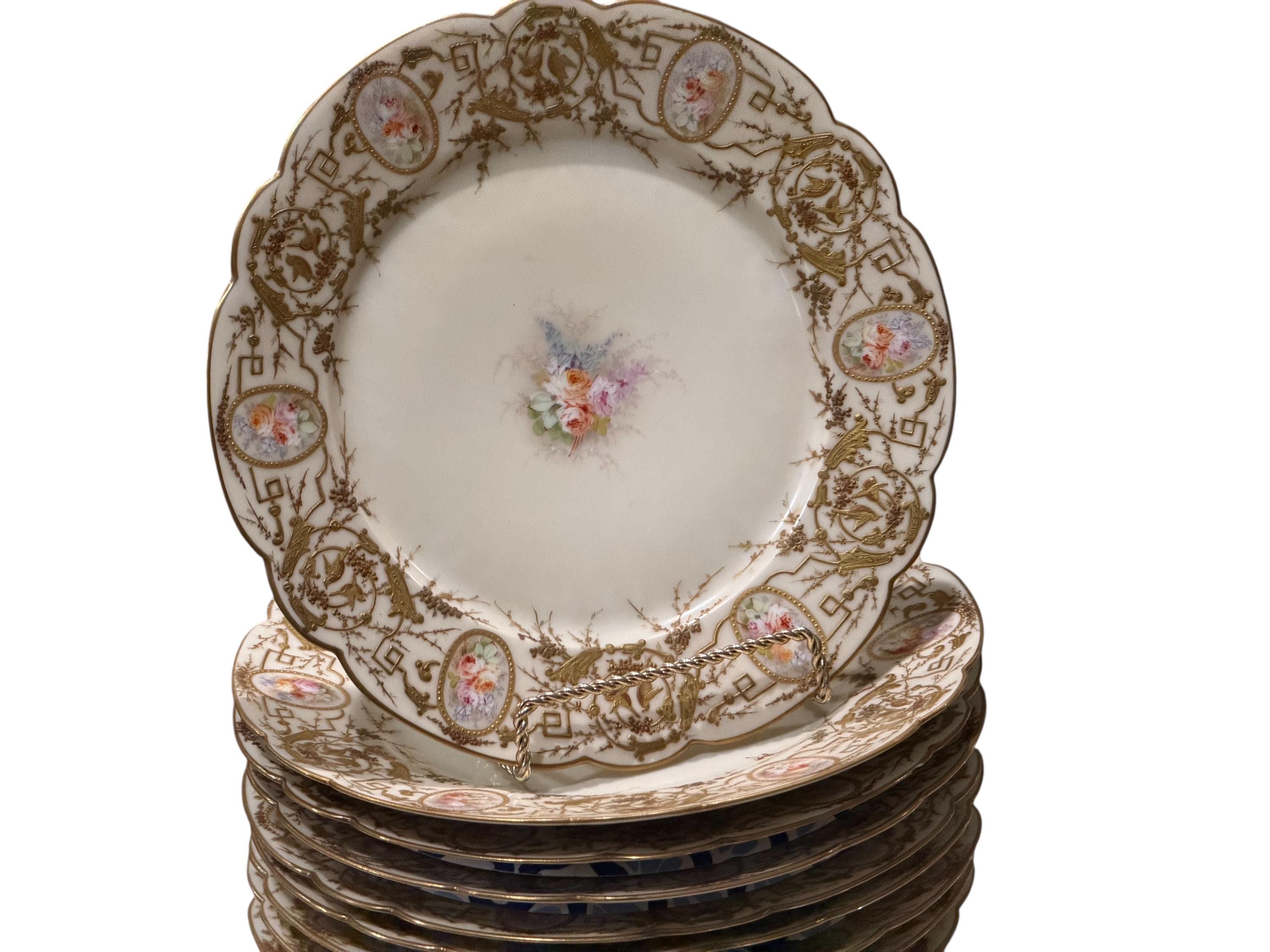 A 9-piece French Old Paris dessert set with an elaborate application of gilding, completely covering the border.
